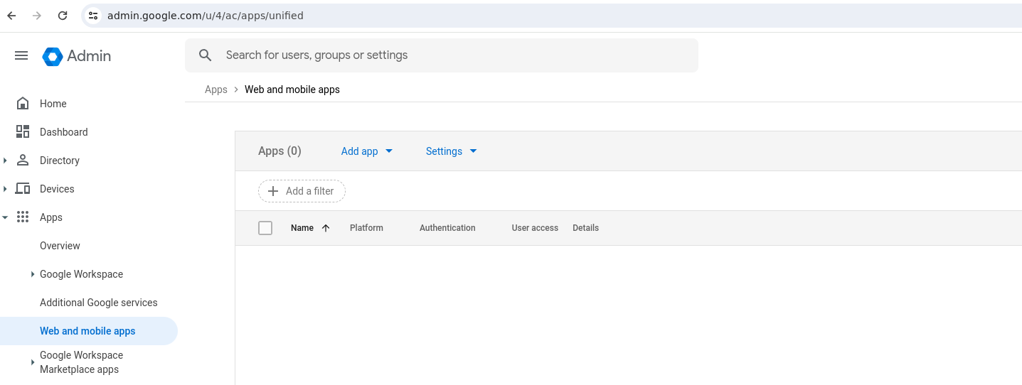 - From the Google Admin console, go to Apps > Web and mobile apps.