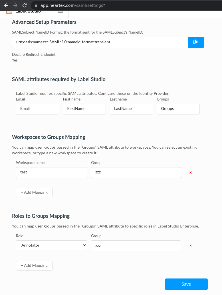 2. Select Manual Enter, enter URLs from the Label Studio Enterprise SAML SSO page.
