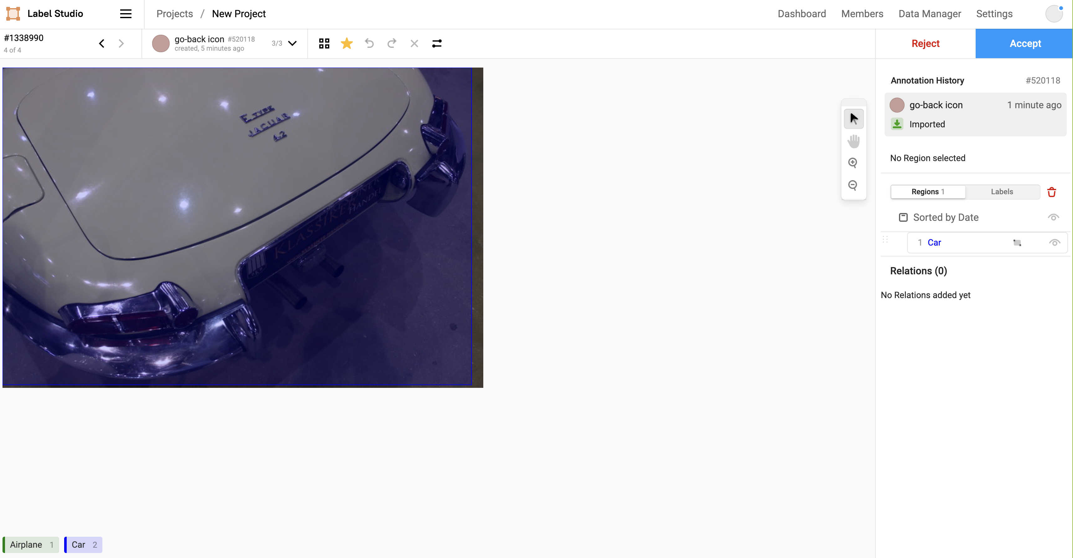• If the annotation is completely incorrect, or you don’t want to attempt to correct it at all, click Reject to reject the annotation. To place a rejected task back in the Label Stream for annotation, you must delete the annotation. Rejecting an annotation does not return it to annotators to re-label.